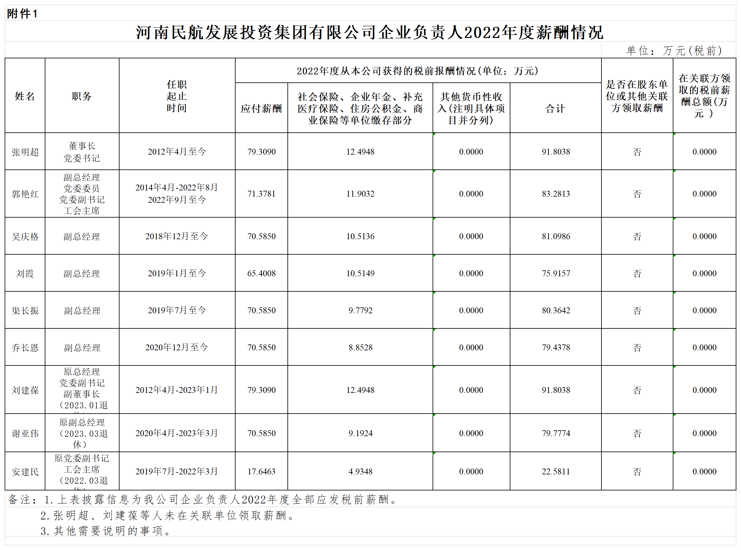 河南民航發展投資集團有限公司企業負責人2022年度薪酬及2020-2022年任期激勵收入情況