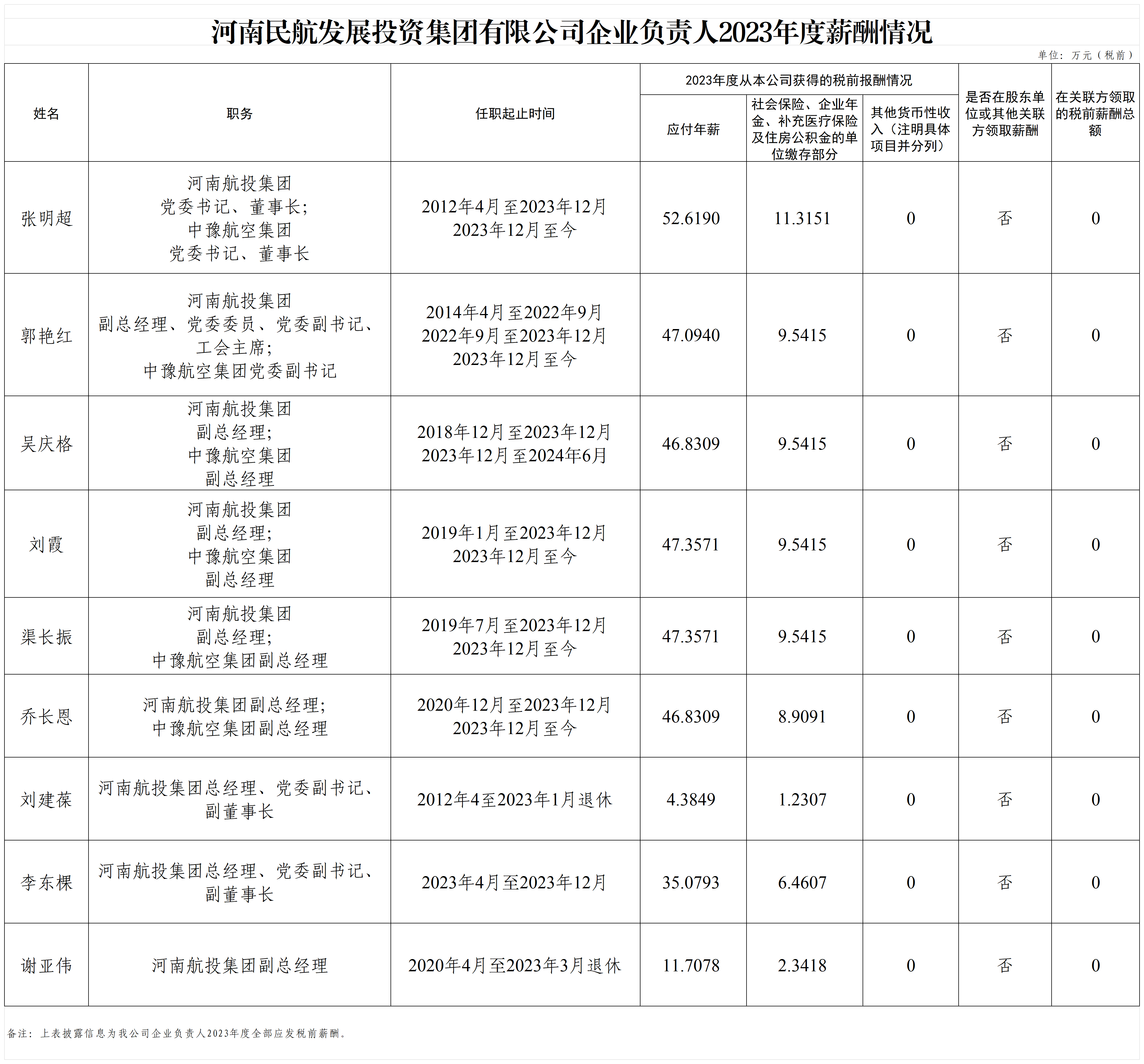 河南民航發展投資集團有限公司企業負責人2023年度薪酬情況