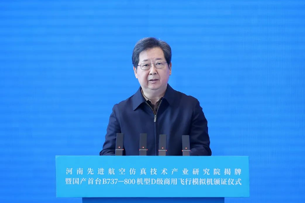 11月26日,河南先進航空仿真技術產業研究院揭牌暨國產首臺B737-800機型D級商用飛行模擬機頒證儀式在航空港區舉行。省委書記樓陽生出席并講話。