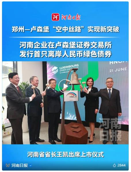當地時間6月21日上午,中豫航空集團以河南航投為主體發(fā)行的3年期人民幣境外債券上市儀式在盧森堡證券交易所舉行。這是中國企業(yè)在歐洲發(fā)行的首只支持可持續(xù)航空燃料(SAF)的綠色債券,也是河南企業(yè)發(fā)行的首只離岸人民幣綠色債券,鄭盧“空中絲路”資金融通實現(xiàn)新突破。