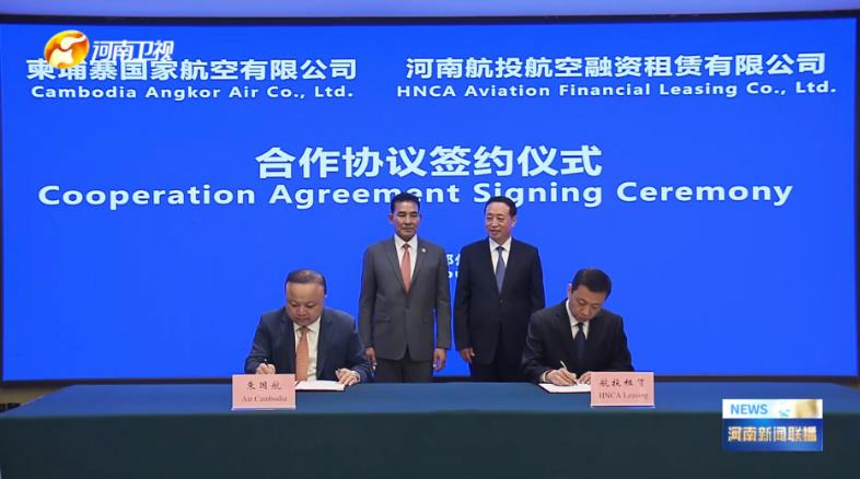 11月2日上午,河南航投航空融資租賃有限公司(以下簡稱航投租賃)與柬埔寨國家航空公司簽署融資租賃合作協議,開展跨境飛機租賃業務。省委常委、常務副省長孫守剛與柬埔寨民航國務秘書處大臣兼柬埔寨國家航空公司董事會主席毛哈萬納共同見證協議簽署。