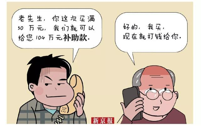 案例:70歲的劉某接到一個“保健專家”的電話,經(jīng)忽悠,劉某買了一萬多元的保健品。然而,對方又稱只要購滿50萬元,即可獲得補助款104萬元。當(dāng)劉某真的購買了遠(yuǎn)超50萬元的保健品后,那個從未謀面的專家再也聯(lián)系不上了。