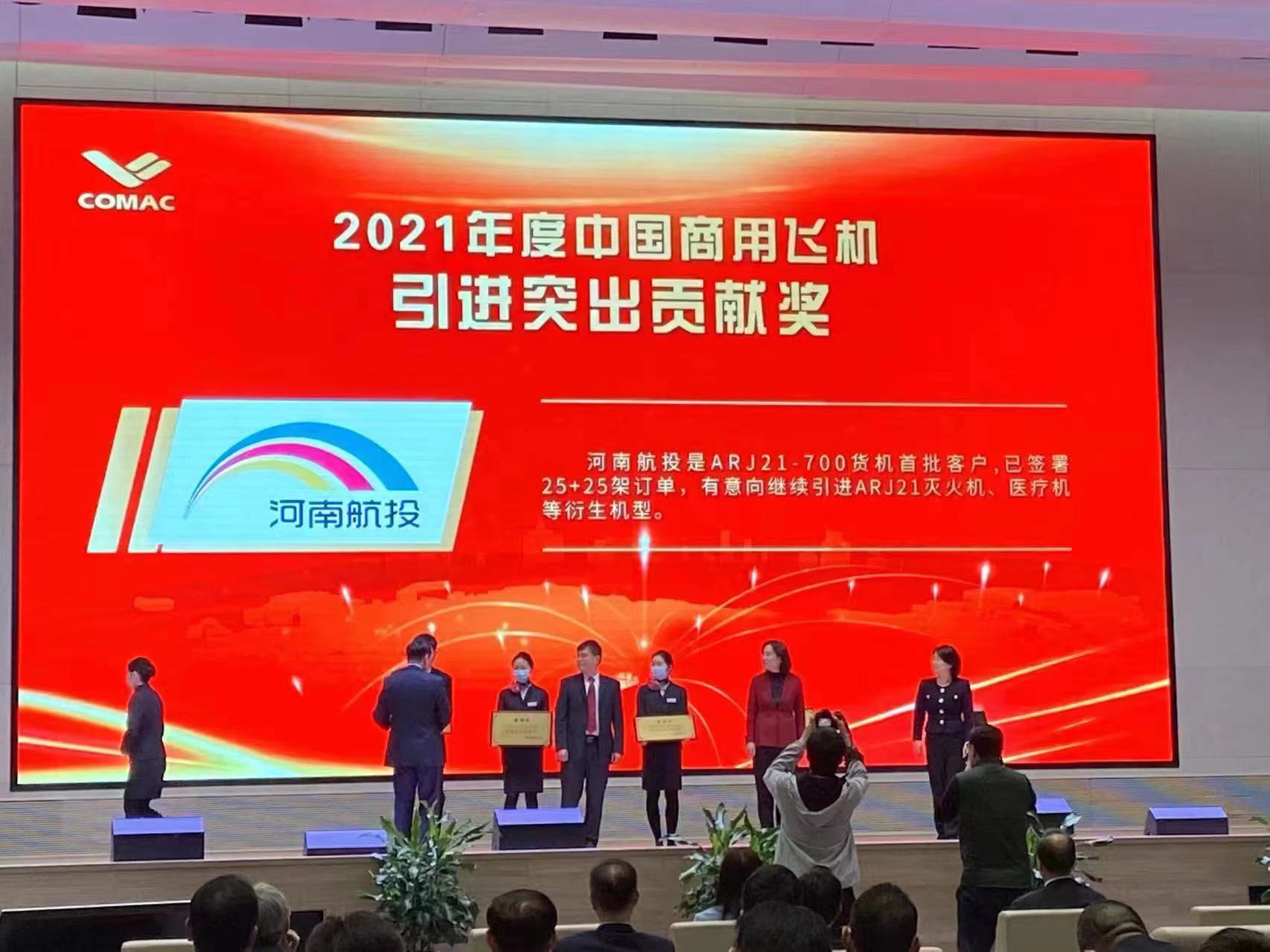 10月26日,中國商飛2022年度客戶大會在嘉興召開。會上頒發了第一屆中國商用飛機“翱翔獎”。由中國商飛黨委書記、董事長賀東風為河南航投頒發“翱翔獎—— 2021年度中國商用飛機引進突出貢獻獎”,這是中國商飛首次將國產商用飛機相關獎項授予河南本土企業,對國產貨機進一步拓展市場具有重要意義。
