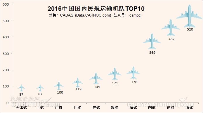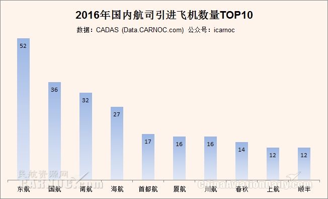 在航空公司中,東航引進(jìn)的飛機(jī)最多,為52架,國航36架、南航32架。
