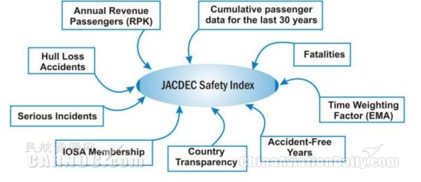 JACDEC安全指標的評比參數包括在過去30年間航班墜毀的數量、傷亡人數、安全年份年數以及航司所在國家政府的透明度等參數。