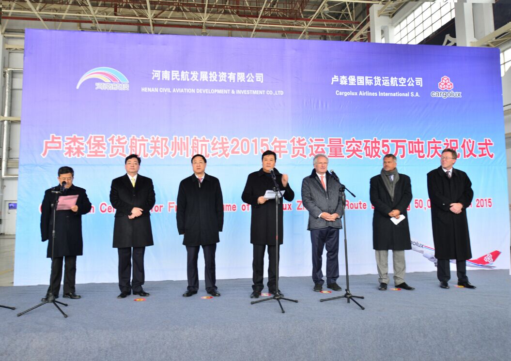 當天中午,河南民航發展投資有限公司與盧貨航聯合在鄭州機場舉行了簡短熱烈的慶祝儀式。河南省副省長趙建才出席儀式并致辭,盧森堡駐華大使石泰嵋宣讀盧森堡可持續發展與基礎產業部部長弗朗索瓦?鮑施的賀信,省政府副秘書長張雷明主持儀式。省直單位有關負責人親臨現場。河南航投董事長、黨委書記張明超,總經理、副董事長、黨委副書記劉建葆,公司領導悅國勇、鄭立亮、郭艷紅以及盧貨航董事會主席保羅?海明格、盧貨航總裁兼CEO德克?李奇同時參加儀式。